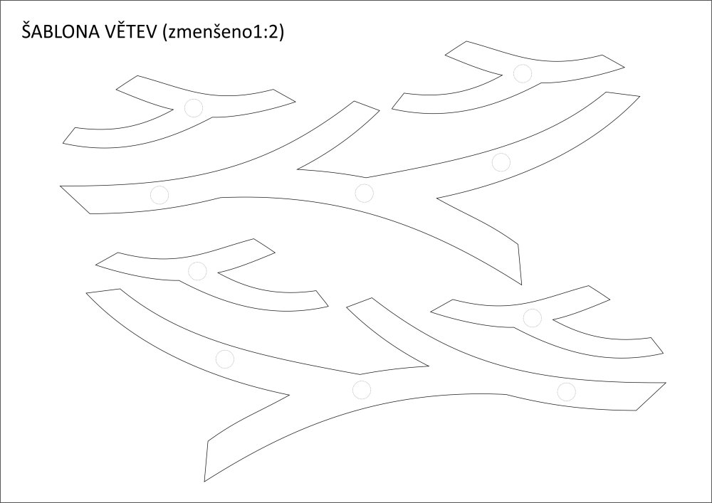 Můžete stáhnout šablonu pro tisk na A4 ve zmenšené poloviční velikosti (klikněte na obrázek níže, po najetí na obrázek pravým tlačítkem zvolte "Uložit obrázek jako ..." a zadejte místo k uložení v počítači). Pak si obrázek můžete standardně vytisknout (přizpůsobit na formát papíru A4), větve vystřihnout a začít tvoři :-).